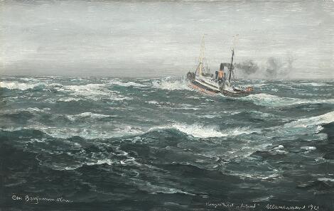 Christian Benjamin Olsen: “Kongeskibet "Island"“. Signed and dated Chr. Benjamin Olsen Atlanterhavet 1921. Oil on canvas. 27 x 43 cm.