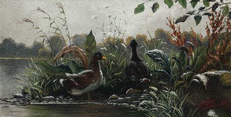Peder Mønsted: A study of ducks on the bank of a lake. Unsigned. Oil on cardboard. 15.5 x 29 cm.