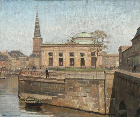 Axel Johansen: From Frederiksholms Kanal seen towards Thorvaldsen's Museum in Copenhagen. Signed and dated Axel Johansen 1925. Oil on canvas. 33.5 x 39.5 cm.