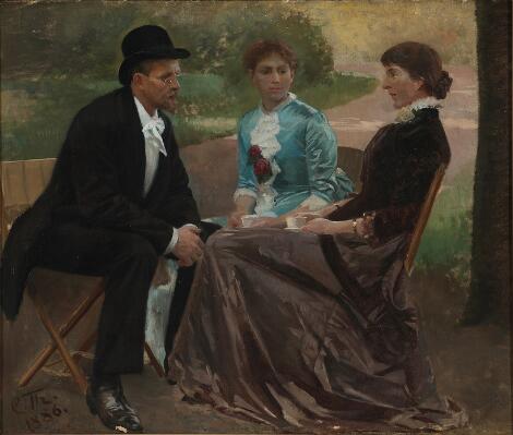 Carl Thomsen: Drinking tea in the garden. Signed and dated C. Th. 1886. Oil on canvas. 47.5 x 56 cm.