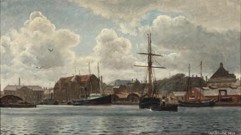 Christian Blache: From Copenhagen Harbour seen towards Toldbodgade. Signed and dated Chr. Blache 1909. Oil on canvas. 32 x 57 cm.