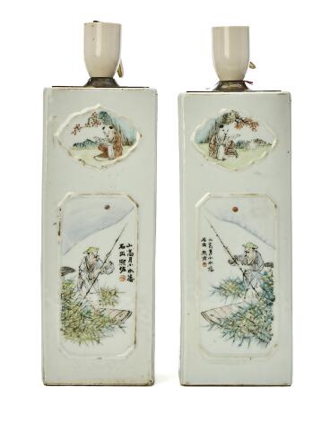 A pair of Chinese late 19th century enamelled porcelain square vases, mounted as lamps. H. excl. the mounts 27 cm. (2)