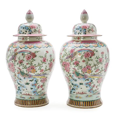 A pair of famille rose vases, Samson; gilt silver covers with indistinct maker's mark, Sweden 19th century. H. 23 cm. (2)