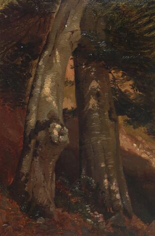 Danish Golden Age Painter, 19th century's first half: Study of trees. Unsigned. Oil on canvas. 31 x 21 cm.
