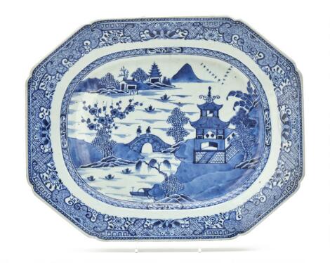 A Chinese export porcelain 'Blue Willow' dish, Qing. 40 x 32 cm.