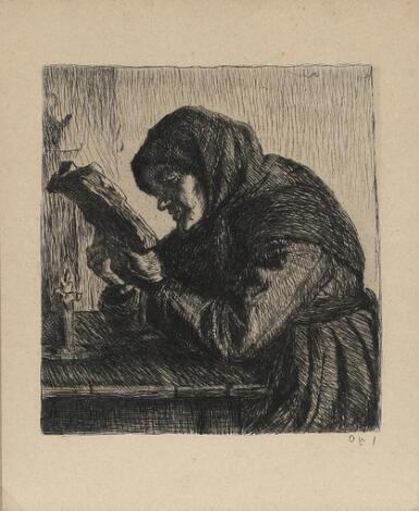 Anna Ancher: An old woman reading. Opus 1. Signed in print. Etching. Visible size 16 x 13.5 cm.