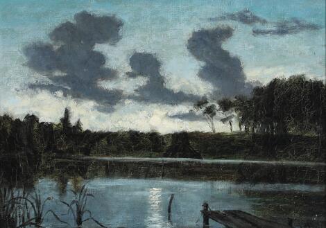 Carl Bloch: Moonlight over a lake. Signed C. B. Oil on canvas. 21 x 28.5 cm.