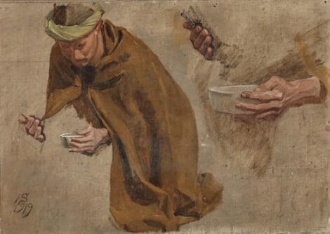 Joakim Skovgaard: A study of a kneeling man holding a bowl. Signed and dated J. S. 1919. Oil on canvas laid on canvas. 37 x 52 cm.