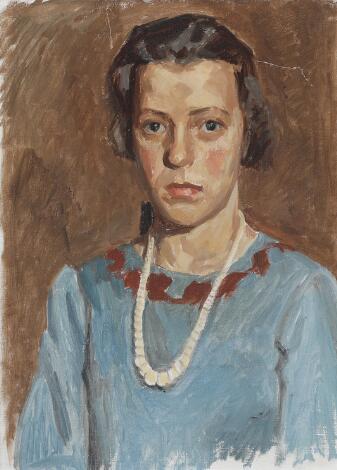 Peter Hansen: Portrait of a young woman in a light blue dress. Unsigned. Oil on canvas. 51 x 39 cm.