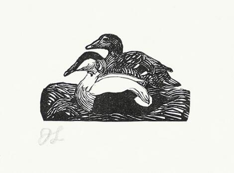 Johannes Larsen: “To Ederfugle”. Two eider ducks. 1921. Signed with monogram in pencil. Woodcut. Sheet size 20×28 cm. Unframed.