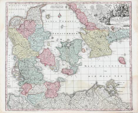 Georg Matthäus Seutter: "Daniæ Regnum". C. 1730. Handcoloured etching. 52.5 x 64 cm. Unframed.
