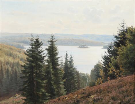 Christian Zacho: A view of Silkeborg lake from a heathered hill side. Signed and dated Chr. Zacho 1890. Oil on canvas. 61 x 80 cm.