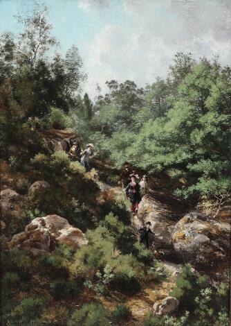 Edmé-Émile Laborne: View from France with a party on a walk in the forest. Signed Emile Laborne. Oil on canvas. 76.5 x 55 cm.
