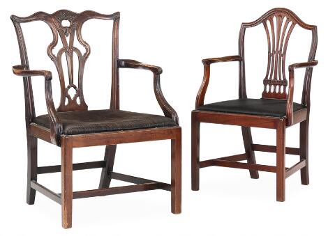 Two English mahogany armchairs, seats upholstered in black horsehair. 19th century. (2)
