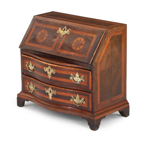 Danish or North German Baroque miniature rosewood bureau with inlays. Chased brass handles and mountings. Ca. 1740. H. 46 cm. W. 49 cm. D. 27 cm.