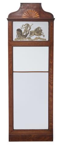 Large Danish Empire mirror in a mahogany frame inlaid with a fan of light wood, upper mirror glass decorated with grisaille. Early 19th century. H. 183. W. 63.