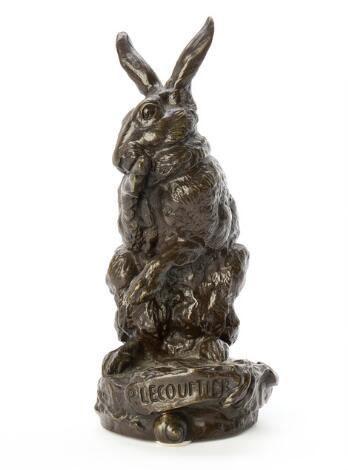 Prosper Lecourtier: A bronze figure of a rabbit grooming, signed P. Lecourtier. Weight 1994 g. H. 25 cm.