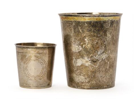 Two Danish Baroque silver snakeskin beakers. Aalborg, 18th century. Weight 236 g. H. 6.5 and 11.5 cm. (2)