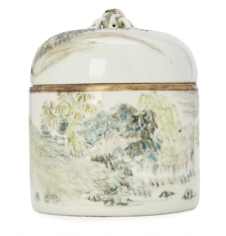 A Chinese famille verte tea caddy. Kangxi 1662-1722. H. 12 cm.