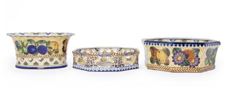 Christian Joachim: Two faience bowls and a jardiniere, decorated in colours with flowers and fruits. Aluminia. L. 24, 25 og 27 cm. (3)