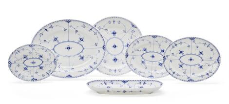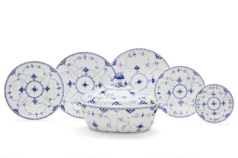"Blue Fluted Half Lace" collection of porcelain dishes, decorated in underglaze blue. Royal Copenhagen. (6)