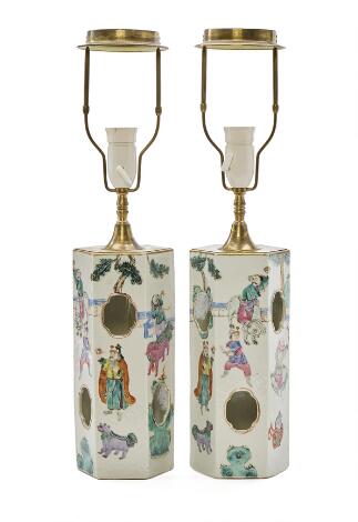 A pair of Chinese enamelled porcelain hatstands of hexagonal form. Late Qing/Republic. Mounted as lamps. H. excl. the mounts 27,5 cm. (2)