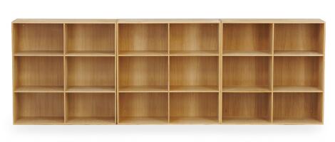 Mogens Koch: Sæt på tre bogreoler af massiv eg. Udført og mærket hos Rud. Rasmussens Snedkerier. (3)