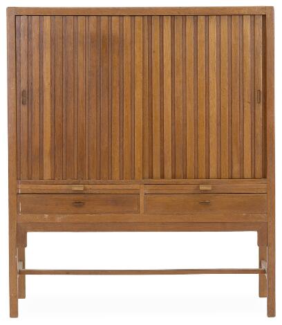 Hans J. Wegner: Dækketøjsskab af eg, front med udtræk, skuffer samt to skydelåger. Indvendigt med justérbare hylder samt udtræksbakker.