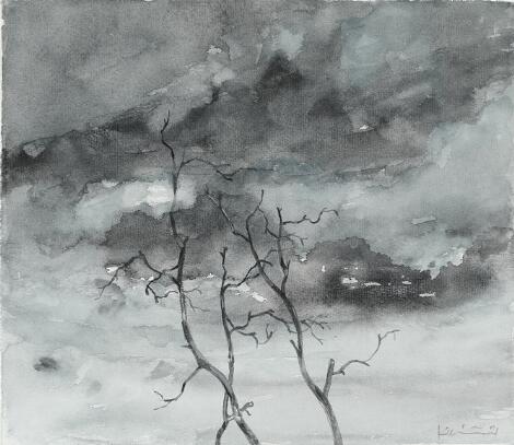 Michael Kvium: "Grey day". Signeret Kvium 21. Akvarel på papir. Bladstørrelse 21,5 x 25 cm.