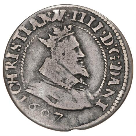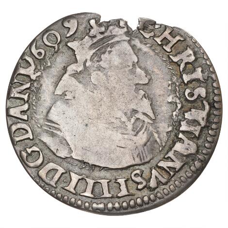 Christian IV, 8 skiling 1609, H 93B, S 23, Knudsen & Nielsen 29 - særdeles sjælden stavefejlsvariant DANKSE