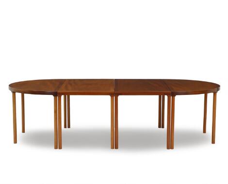 Arne Karlsen: Spisebord af mahogni i fire dele, bestående af to rektangulære borde og to D-ender. (4)