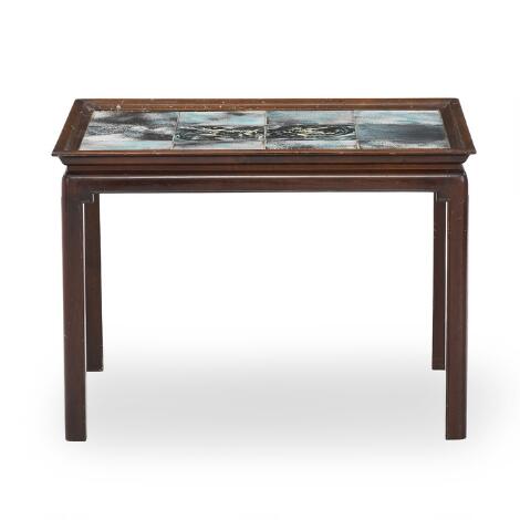Frits Henningsen, Jens Thirslund: Sofabord af mahogni. Top med kakler. H. 51. L. 72. B. 56.