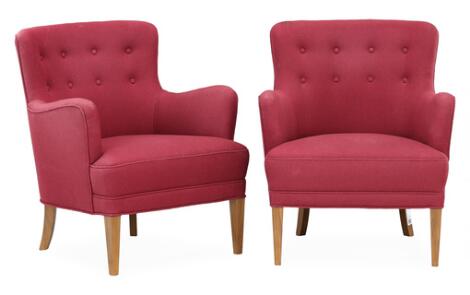 Jacob Kjær: Et par lænestole med ben af bejdset bøg. Betrukket med lilla uld. Uført 1950érne. (2)