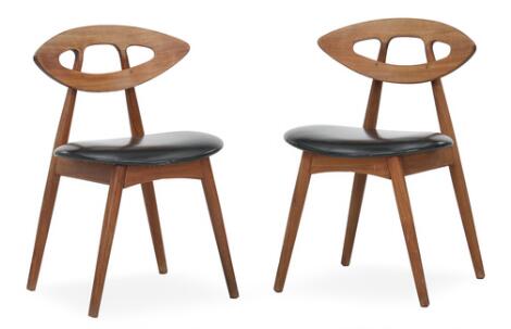 Ejvind A. Johansson: Et par spisestuestole af teak med ovalt tilspidsende rygstykke på skråtstillede ben. Sæder betrukket med sort skai. (2)