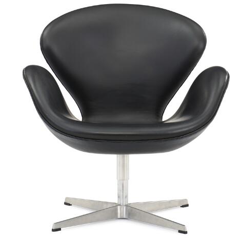 Arne Jacobsen: “Svanen”. Loungestol betrukket med sort skind, med stamme af stå og fod af aluminium.