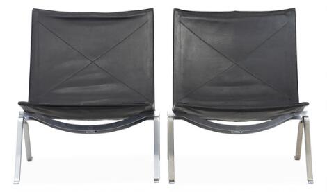 Poul Kjærholm: "PK 22". Et par lænestole med stel af stål, betrukket med sort skind. Udført hos Fritz Hansen. (2)
