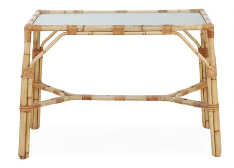 Dansk møbeldesign: Bord af rattan og flet. Topplade af glas. H. 73. L. 100. B. 71.