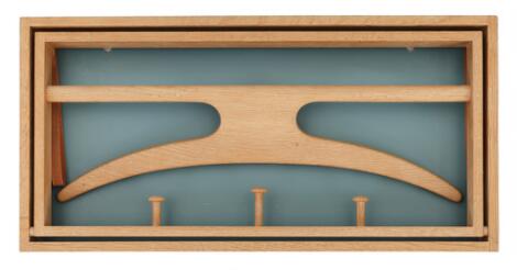Adam Hoff, Poul Østergaard: Sammenklappelig bøjle-knagerække af eg med grønblå lakeret baggrund, stropper af kernelæder.