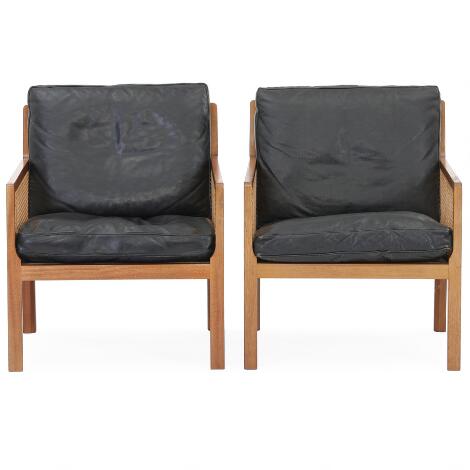 Bernt: Et par lænestole af mahogni. Side og ryg udspændt med flet. Løse hynder i sæde og ryg betrukket med soert skind. (2)