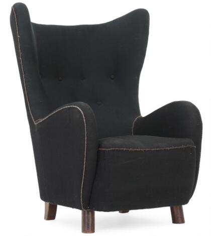 Dansk snedkermester: Højrygget lænestol med ben af bejdset bøg. Sæde, sider og ryg betrukket med mørk uld. Udført 1940érne.