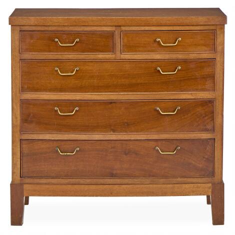Dansk snedkermester: Kommode af nøddetræ. Front med fem skuffer med greb af messing. H. 74. B. 76. D. 41.