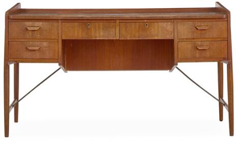 Dansk møbeldesign: Skrivebord af teak med skråstivere af messing. H. 75. L. 135. D. 70.