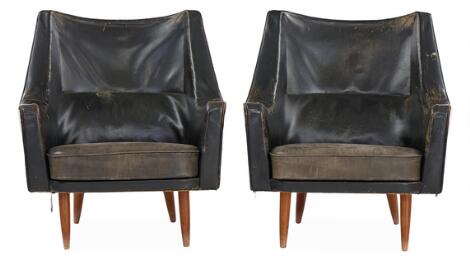 Ib Kofod-Larsen: Et par lænestole med stel af teak. Sæde, sider og ryg betrukket med patineret sort skind. (2)