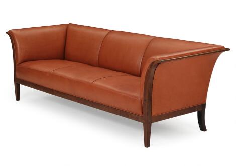 Frits Henningsen: Tre-personers sofa med stel af mahogni, betrukket med cognacfarvet skind. 1940-50'erne. L. 211.