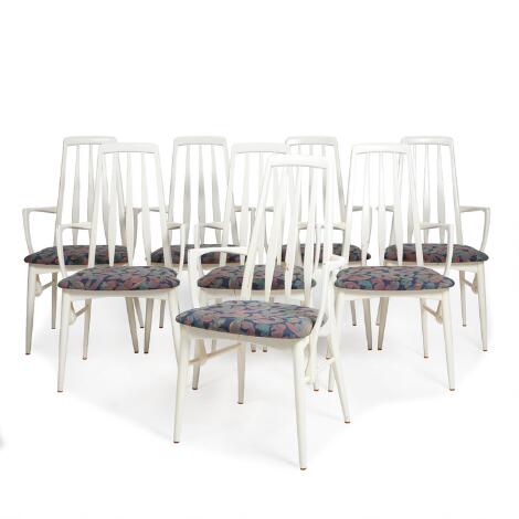 Niels Koefoed: "Eva". Otte armstole af hvidmalet eg, betrukket med mønstret møbelstof. Hornslet Møbelfabrik. (8)