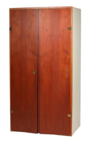 Børge Mogensen, Grethe Meyer: "Boligens Byggeskabe". Klædeskab af grålakeret træ med låger af teak. Udført hos C. Danel.
