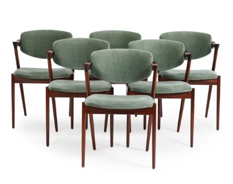 Kai Kristiansen: Seks armstole med stel af palisander. Sæde og vipperyg betrukket med grønt velour. (6)