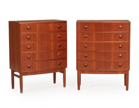 Kai Kristiansen: Par kommoder af teak, buet front med fem skuffer. Udført hos Feldballe møbelfabrik. H. 78. B. 60. D. 32. (2)