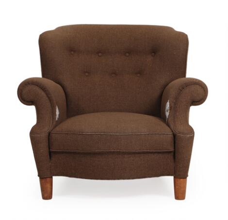 Dansk møbeldesign: Overpolstret lænestol betrukket med brunt uld, ben af eg. 1940'erne.