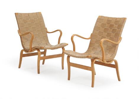 Bruno Mathsson: “Eva”. Et par hvilestole af formbøjet bøg. Stemplet Bruno Mathsson design. (2)
